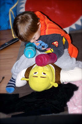 "BYE"(Minol will put on his clothes, shoes, hat...grab a bag and head for the door saying "Bye. Bye Mumma" and I'll even get a kiss and a wave. He's even got his doggy key ring in these pics.)